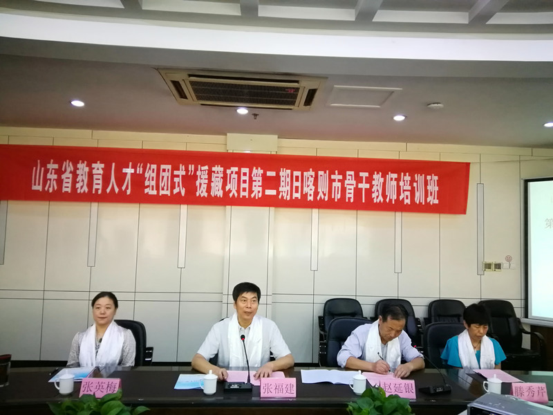 2017年9月9日上午,山东省教育人才“组团式”援藏项目——第二期日喀则市骨干教师培训班在济南开班。副校长张福建、双语教师援疆教学中心主任、教师教育学院院长赵延银、副院长张英梅等出席开班典礼。参加典礼的还有西藏日喀则市的30名骨干教师以及本次培训班班主任工作团队。开班典礼由赵延银院长主持。