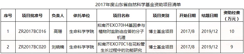 据山东省自然科学基金委员会文件《关于下达2017年度山东省自然科学基金计划(第一批)的通知》,我校生命科学学院教师高珊、刘晓楠老师申报项目喜获优秀中青年科学家科研奖励基金(博士基金)项目立项(立项具体信息详见附表)。