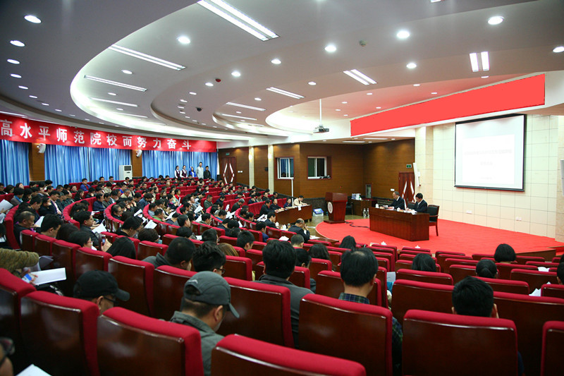 党委书记王玉华首先对迎评工作作动员讲话。他指出:此次动员大会的召开,标志着我校迎评工作正式进入倒计时。这是迎评工作的战前动员会,目标明确、任务单纯,全校上下要团结一致,站位全局,服从大局,聚精会神促评建,真抓实干搞教学,全心全意做服务。同时,代表学校党委提出三点要求:一要统一思想,提高认识,增强紧迫感;二要对照标准,尽心尽责,真抓实干;三要落实责任,严明纪律,实现目标。相信在全校教职员工的共同努力下,一定能够圆满完成此次本科教学合格评估,开创我校发展的新局面!