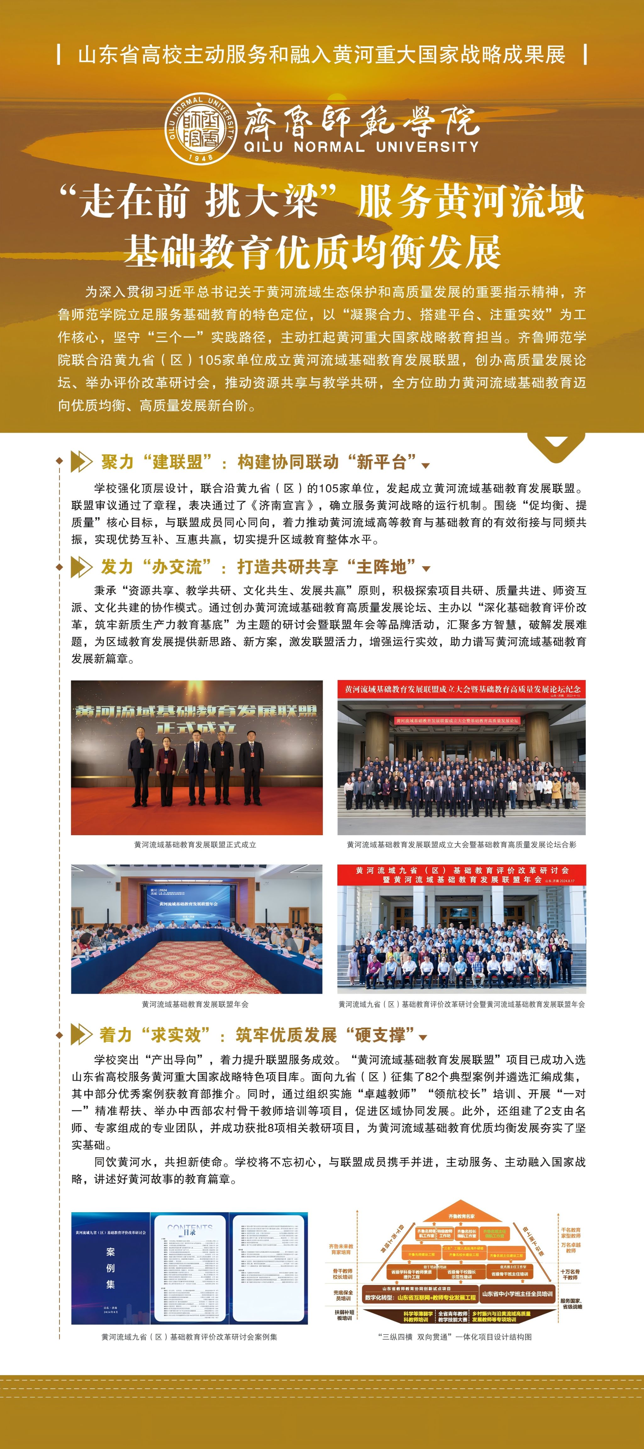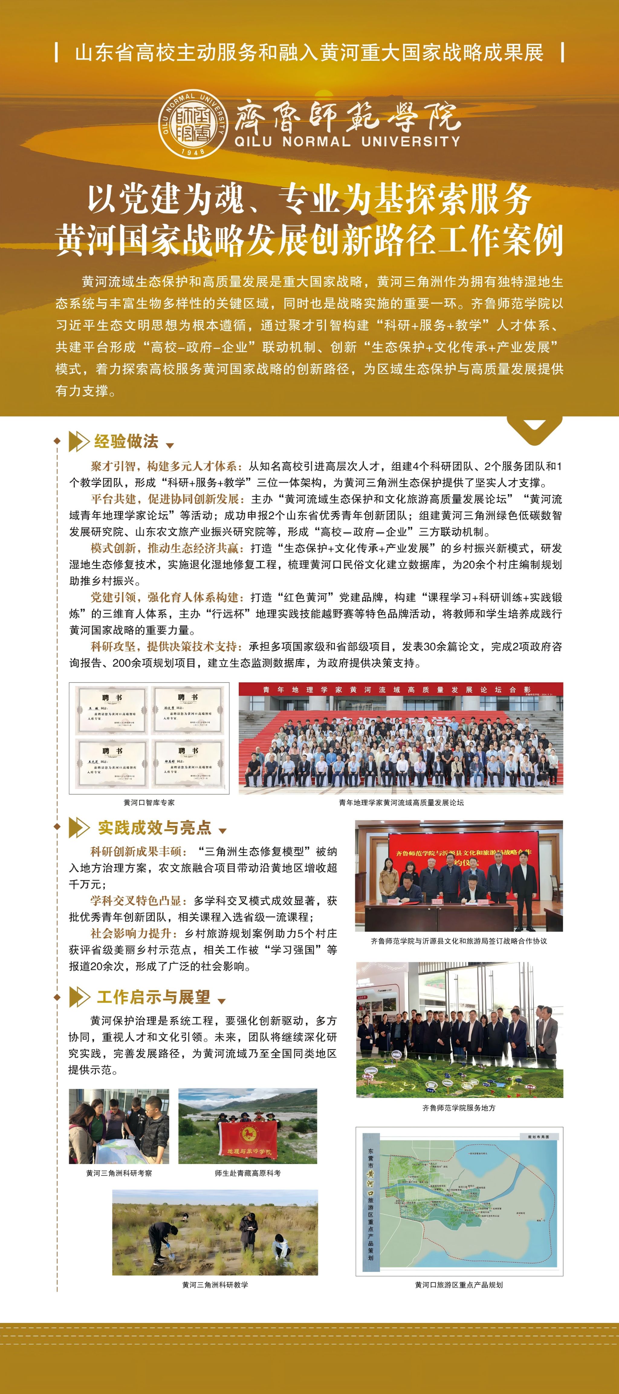 近年来,学校高度重视服务和融入黄河重大国家战略相关工作,始终自觉扛牢“走在前、挑大梁”的责任担当,立足办学定位与学科专业优势,推出一系列务实举措。立足服务基础教育的特色定位,以“凝聚合力、搭建平台、注重实效”为工作核心,坚守“三个一”实践路径,主动扛起教育担当,全方位助力黄河流域基础教育迈向优质均衡、高质量发展新台阶。通过聚才引智构建“科研+服务+教学”一体化人才体系,整合校内外优质资源共建平台形成“高校-政府-企业”联动机制,创新实践“生态保护+文化传承+产业发展”融合模式,多维度发力探索高校服务黄河国家战略的创新路径,为区域生态保护修复与经济社会高质量发展提供了有力的智力支持与人才支撑。